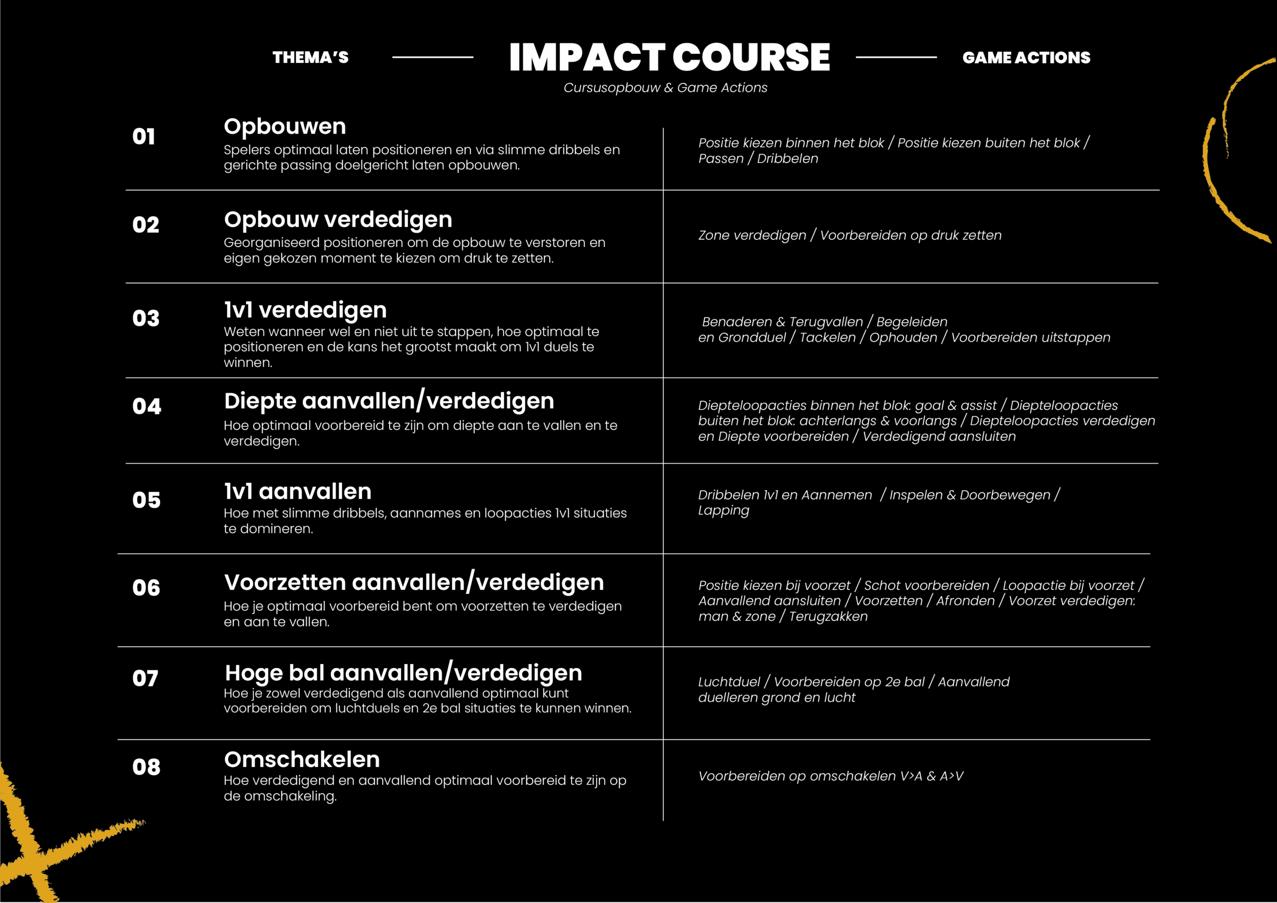 In de Impact Cursus leer je alle Game Actions die jouw spelers die jouw spelers in staat stellen om te domineren op het veld. Je leert hoe je positionering optimaliseert – zowel aanvallend als verdedigend – en hoe je doelgericht aanvallen en agressief verdedigen integreert zonder de controle over het spel te verliezen.